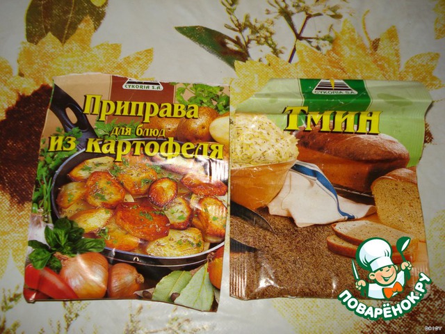 Посыпаем солью, тмином, приправой для картофеля (раньше мы делали и без нее, а вот тмин добавляли всегда, он придает особый вкус нашей картошке). Опять руками все перемешиваем.