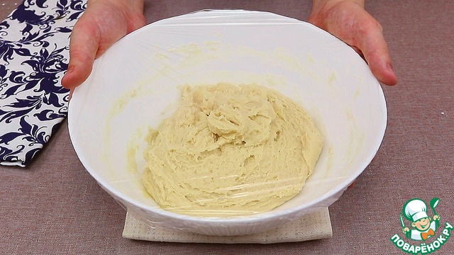 Муку смешиваем с разрыхлителем (можно заменить на 0.5 ч. л. соды). Просеиваем и замешиваем тесто вилкой или лопаткой. Тесто получается вязкой и липкой консиситенции. Накрываем пищевой пленкой и убираем на 30 минут в холодильник. После холода тесто не будет прилипать к рукам.
