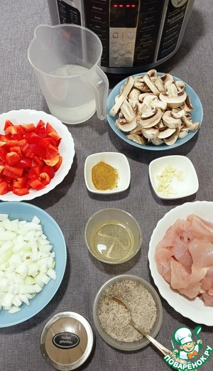 Курица с грибами - Рецепт для приготовления в МУЛЬТИВАРКЕ. Куриное мясо достаточно универсальное. Оно и недорогое при покупке, и просто в готовке, и достаточное полезное при потреблении. Данный рецепт будет интересен своей яркостью — белое куриное мясо, желтое карри, и красный перчик. А как украшение пойдет зеленый укроп. Вообще блюдо получиться и красивым, и ярким и вкусным. Итак впереди нас ждет - Курица с грибами Гликемический индекс — Низкий, Калорийность — 105 ккал/100гр (Низкая) Данный рецепт можете использовать в любой мультиварке (я использовал мультиварку Redmond RMC-M40S 700W)
