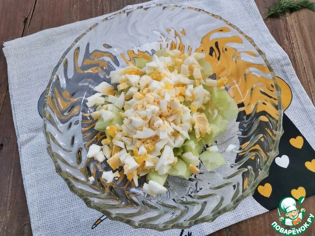 Яйца отварить и нарезать не слишком мелкими кусочками.