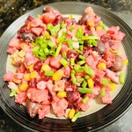 6. Соединяем все покрошенные ингредиенты с консервированной кукурузой, луком, оливками, перцем, маслом и солью.