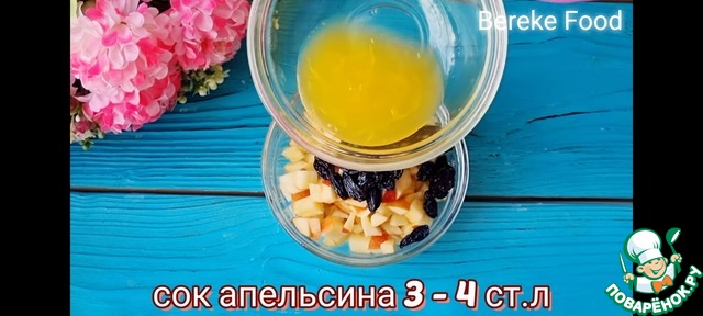 Яблоко нарезаем на небольшие кусочки к яблокам добавляю изюм по желанию орехи и все заливаю выжитым апельсиновым соком и хорошо перемешиваю. Затем добавляем в овсянную смесь и хорошо перемешиваем.