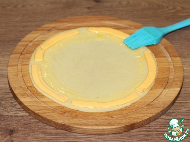 17. Каждую часть теста раскатываем в круг (ф=17 см) и кладем порезанный пластинчатый плавленный сыр. Пластинчатый сыр, можно заменить на твердый, тертый сыр.