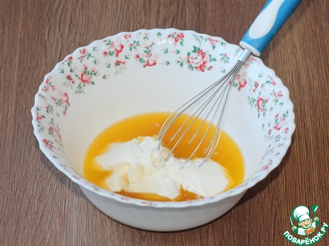 9. Взбиваем куриные яйца (2 шт) с сахаром (50 г). Добавляем творог, мягкое сливочное масло и джем, взбиваем миксером.