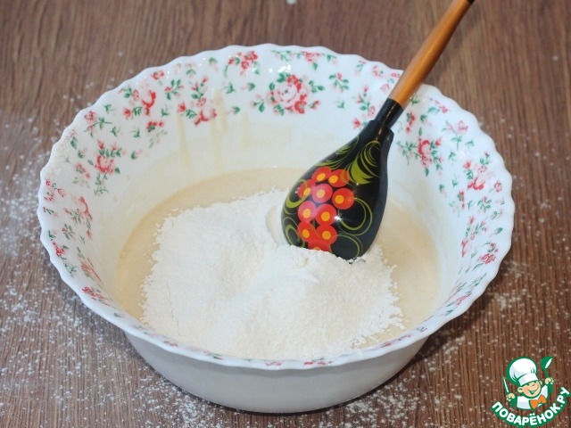 1. Приготовим опару. В теплом молоке 60 мл растворяем дрожжи 5 г, сахар 1 ст. л. и муку 2 ст. л.. Миску с опарой накрываем и оставляем до активации дрожжей, минут 30.
