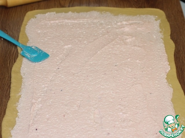 11. И раскатываем в пласт. Раскладываем начинку и равномерно распределяем. С трех сторон оставляем полоски теста по 1,5 см без начинки.