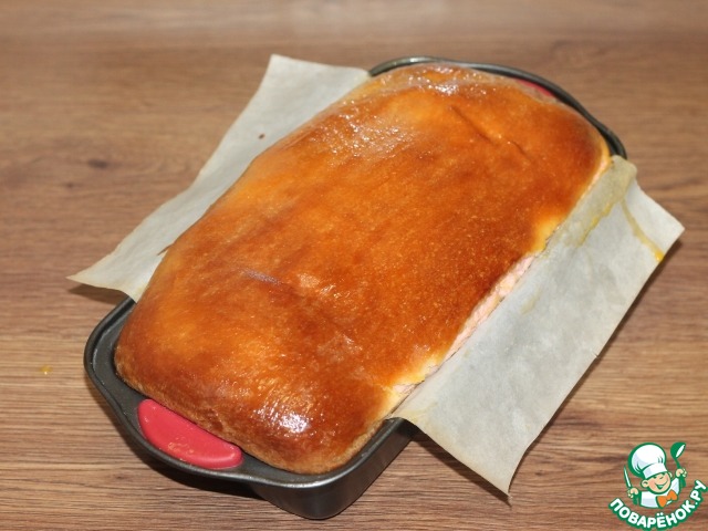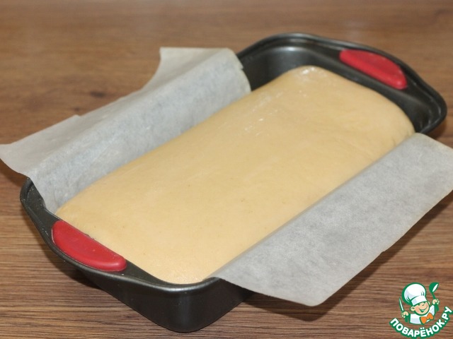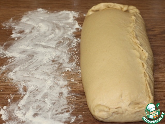 13. Застилаем форму для выпечки пекарской бумагой, смазываем сливочным маслом и выкладываем рулет. Накрываем рулет промасленной бумагой (внутри), сверху полотенцем или пленкой и оставляем на 1 час или до подъема в 2 раза.