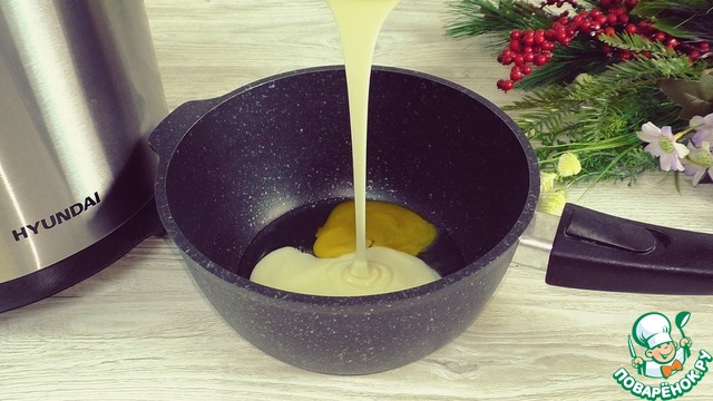 Вливаем сгущённое молоко и ставим на плиту, на среднем огне, постоянно перемешивая доводим смесь до кипения и сразу снимаем с огня.