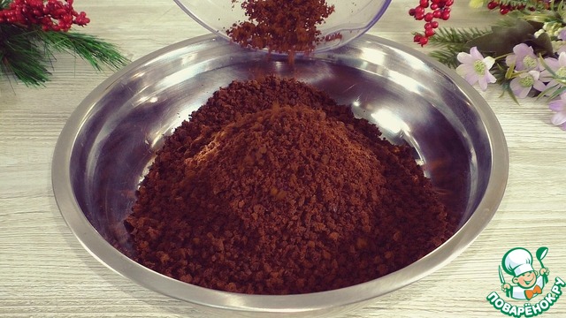Смешиваем бисквитную крошку с кремом, перемешиваем. -