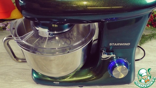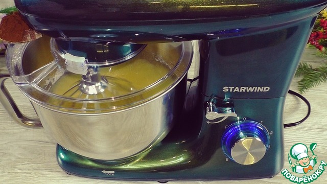 Для начала надо приготовить тесто для бисквита, для этого я белки отделяю от желтков. В белки добавляем щепотку соли и взбиваем до побеления и увеличения массы, я замешиваю тесто в планетарном миксере Starwind SPM7166. Миксер обладает мощностью 1600 Вт и 6 скоростными режимами работы. В комплекте к нему идут 3 насадки: венчик для взбивания, крюк-насадка для теста и лопатка для перемешивания, также предусмотрена защитная крышка, которая предотвращает разбрызгивание жидких ингредиентов, и силиконовая лопатка.