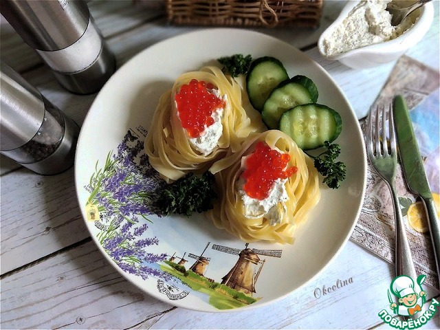 Подаём сразу. На пасту выкладываем крем, красную икру (рыбу красную) и дополняем блюдо зеленью. У меня свежий огурец и петрушка.