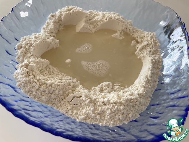 В миску выкладываем муку и соль, перемешиваем, делаем углубление и наливаем воду.