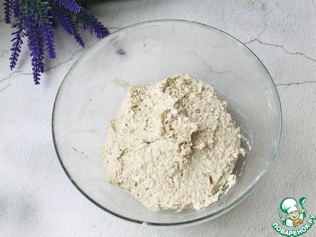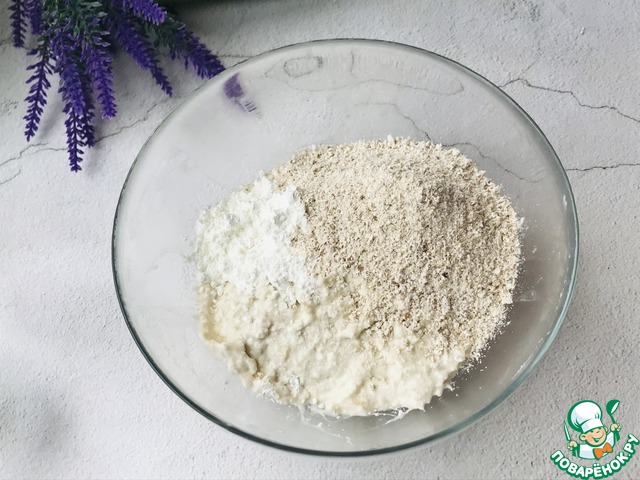 Добавляю крахмал, разрыхлитель, овсяные хлопья. Перемешиваю. Овсяные хлопья лучше добавлять не все сразу. Возможно их уйдёт меньше, чем по рецепту. Это зависит от влажности творога.
