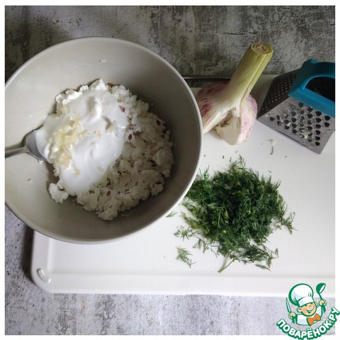 В творог выкладываем сметану, щепотку соли, перец чёрный свежемолотый по вкусу и мелко нарезанный укроп. Натираем на мелкой тёрке чеснок или выдавливаем. Соединяем.