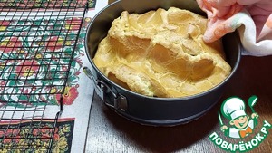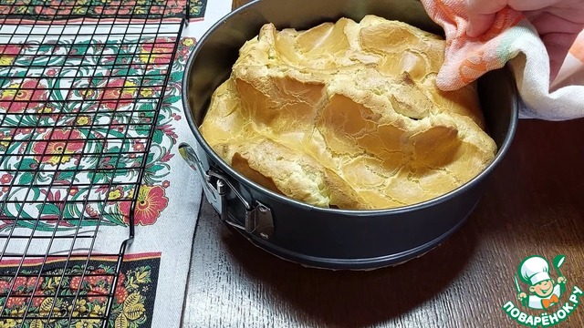 За это время испекся второй корж. Также достаем его из формы, перекладываем на решетку- пусть остывает. Остывают заварные коржи очень быстро. За это время можно подготовить форму для сборки торта. Я буду использовать разъемное кольцо диаметром 22 сантиметра, бортики застелила ацетатной лентой. На дно формы укладываем нижний корж. У меня тот корж, который испекся вторым.
