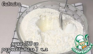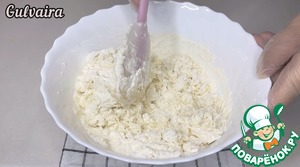 К сметане добавляем муку с разрыхлителем и все перемешиваем с помощью лопаточки.