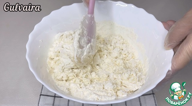 Когда становится тяжело перемешивать лопаткой, перекладываем тесто на стол и собираем тесто.
