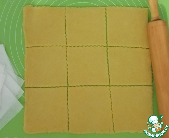 Я вырезала из пергамента квадраты, на которые выкладывала тесто, в центр немного начинки, склеить края, переложить на противень и добавить ещё начинку.