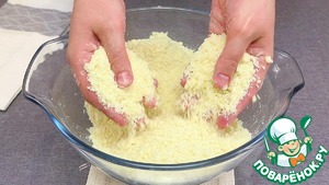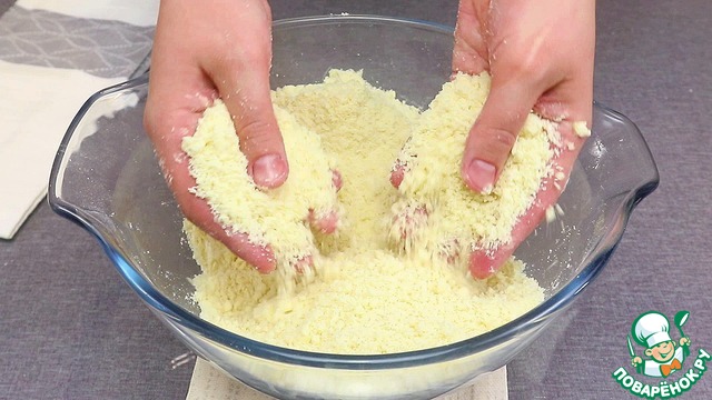 Смешиваем сухие ингредиенты: муку, сахар, соль, разрыхлитель, ванилин. Добавляем холодное сливочное масло, перетираем в крошку.