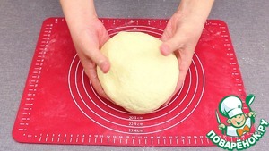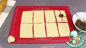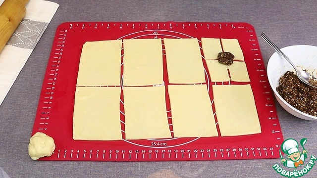 Тесто делим на 4 части. Каждую часть раскатываем в пласт размером ~ 20*30 см. Обрезаем края, разрезаем на 8 сегментов. Делаем надрезы, укладываем начинку и формируем цветочек.