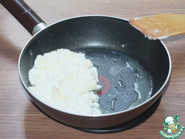 2. Затем жидкость удаляем, можно через сито, а можно ложкой, и продолжаем сушить творог, постоянно перемешивая до испарения жидкости, минут 5. Творог не зажаривать до коричневого цвета, он должен быть белый. Всю жидкость, мне не удалось удалить.