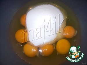 Яйца быстро взбить с сахаром и ванильным сахаром. -