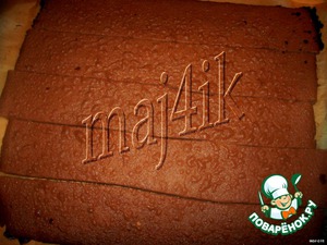 Прямоугольный корж разрезать на одинаковые полоски (5-6 штук).