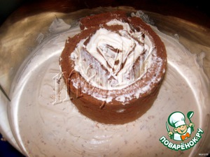 Теперь намазать кремом каждую полоску и "обматывать" ими рулетик в середине.