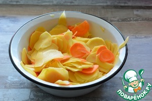 Очищенные сырые картофель и морковь нашинкуйте на специальной шинковке очень тонкими кружочками