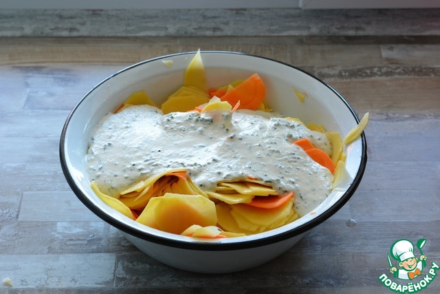 Рецепт «Картофельный гратен с морковью и творогом»: