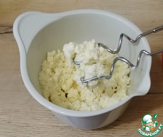 массу можно смешать вилкой, затем добавить оба вида муки, если у вас творог сухой, можно чуть уменьшить количество муки или добавить чуть больше сметаны.
