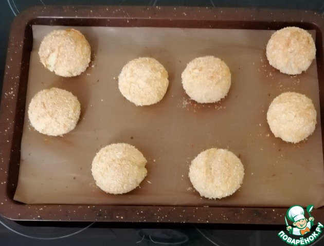 Каждый кусочек подкатать в шар, слегка обвалять в кокосовой стружке и