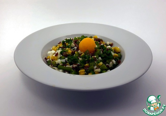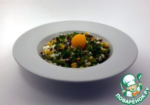 7. К рису добавляем яйца, кукурузу, фасоль и лук комнатной температуры. При перемешивании, салат будет почти комнатной температуры.