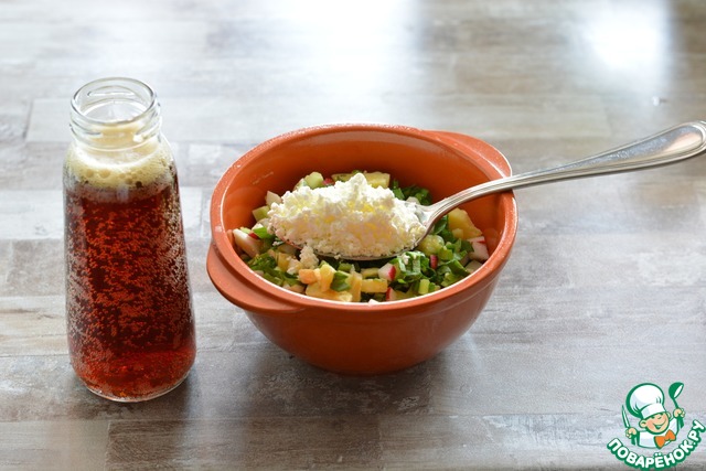 Вместо мясной составляющей в эту окрошку предлагаю добавить творог.