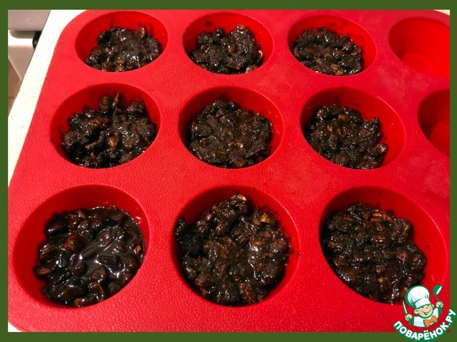 • 7. Все хорошо перемешиваем и формируем конфеты в силиконовых или других формочках. Форму закрываем пищевой пленкой.