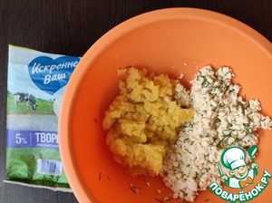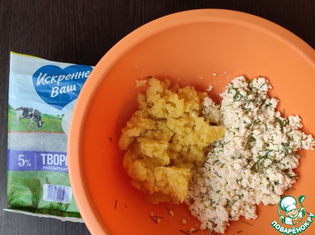 Готовый картофель размять и отправить к творогу, тщательно перемешать.
