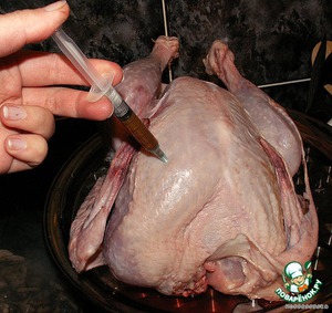 Берем медицинский шприц. Смешиваем 100 г соевого соуса пополам с растопленным сливочным маслом (50 г) и, слегка остудив, начиняем шприц. Прокалываем птичку в нескольких местах, чем больше, тем нежнее мясо. Оставляем на три - четыре часа -