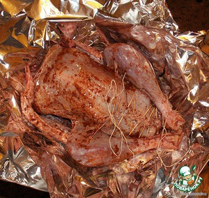 Укладываем птичку, закрываем неплотно фольгой. Ставим в духовку при температуре 250 градусов. Забываем на 1,5 часа.