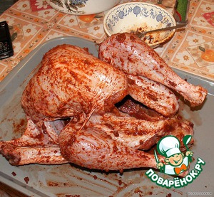 Готовить начинаем за 3,5 часа до подачи на стол. Аджику смешиваем с перцем и солью, натираем промытую птичку снаружи и изнутри.