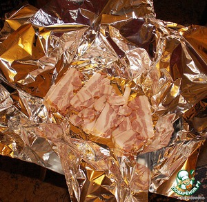 Выстилаем поддон фольгой, укладываем на дно остатки грудинки. Тогда птичка не пристанет к фольге, и заодно пропитается жиром.
