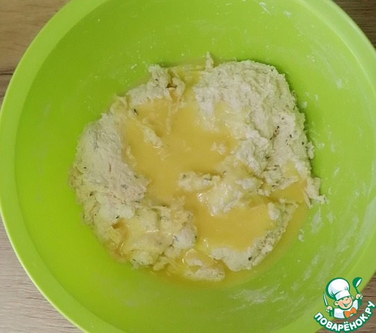 Творог с чесноком добавить в опару. Туда же выложить сметану, оставшийся сахар, добавить разрыхлитель и просеянную муку. Не закладывайте сразу всю муку, в разных регионах она разная по качеству.