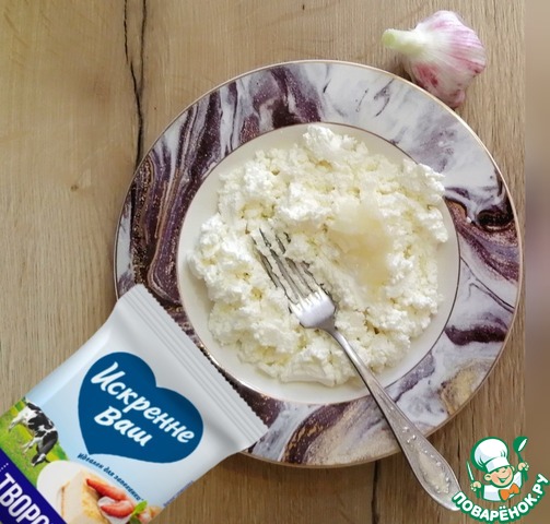 Молодой чеснок истолочь с солью и добавить к творогу 5% жирности.