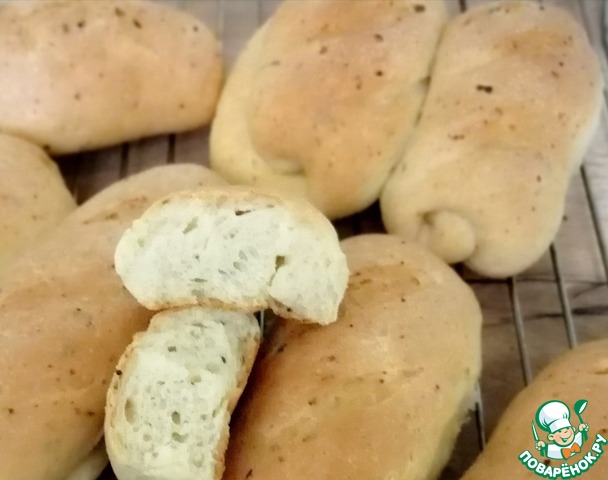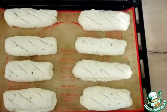 я разделила на восемь частей, каждую размять в пласт и скатать рулетиком, выложить на противень, смазанный маслом или застеленный антипригарным ковриком. Пока тесто расстаивается, включить духовку на разогрев до t 180° С.