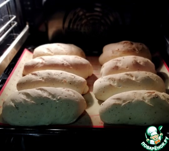 Когда духовка немного нагреется, можно поставить туда противень с батончиками, но не закрывать полностью дверцу. Таким образом ускориться расстойка. Вы увидите, что поверхность теста из глянцевой станет матовая, теперь закрывайте дверцу духовки и выпекайте до готовности, в разных духовках это может занять от 30 до 40 минут.