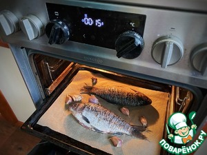 Поставить запекаться в разогретую до 230 градусов духовку на 15 минут. Режим "Конвекция+Гриль". Через 10 минут после начала приготовления рыбу перевернуть и запекать еще 5 минут до образования аппетитной корочки.