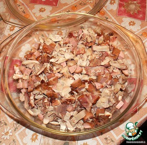 Обдираем индейку, мелко режем мясо, так же мелко режем всю начинку.