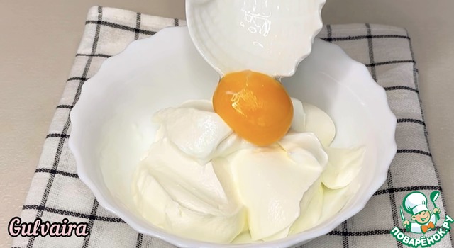 В отдельной миске смешиваем сметану с одним яичным желтком. Перемешиваем и добавляем к сухой смеси.
