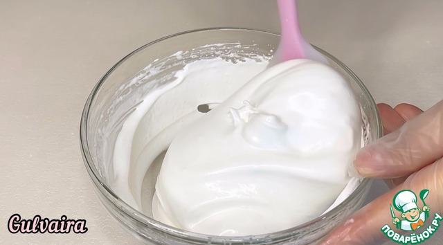 Когда образуется пенка постепенно добавляем сахар. Взбиваем в пышную массу.
