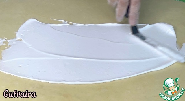 На тесто выкладываем взбитые белки и распределяем равномерно по поверхности лопаточкой.