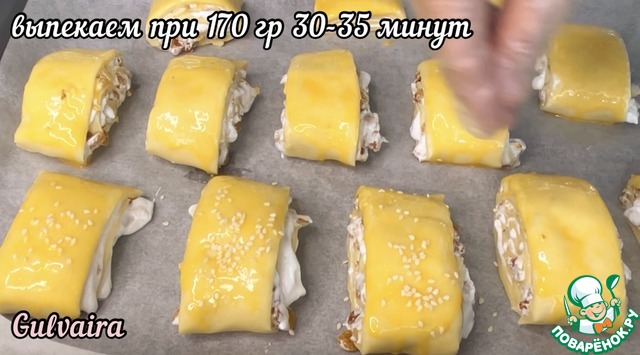 Перекладываем на противень. Сверху смазываем яичным желтком +молоко, и посыпаем кунжутом. Выпекаем при 170 гр 30-35 минут.